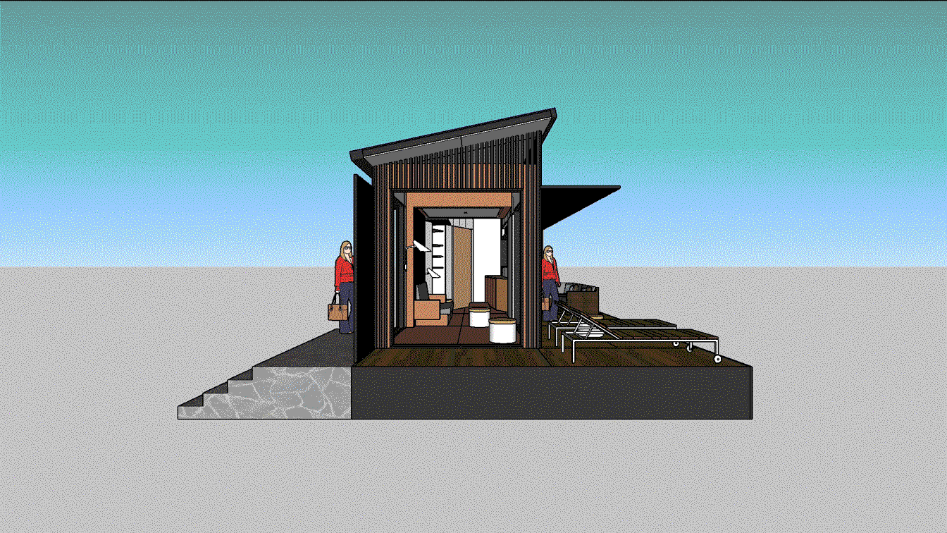 Design of a 24’ x 8.5’ off-grid short-term dwelling with attached outdoor space developed for a Paso Robles, California vineyard.